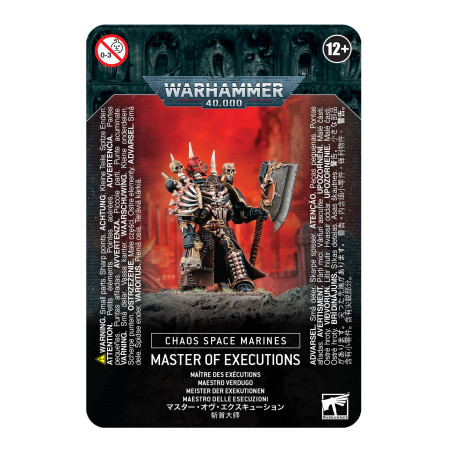 The Master of Executions is multipart plastic kit. He is a striking HQ choice in a Chaos Space Marines army whose sole purpose is to eliminate enemy characters with his fearsome (and utterly enormous) axe of dismemberment. The model displays all the grisly hallmarks of an executioner, with a trophy rack, bone decoration all over his armour, and he also clutches a pair of recently decapitated heads in his right hand.