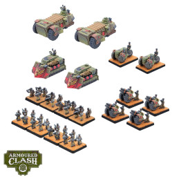 In this Armoured Clash Regiment box, you will find varied support options for your Commonwealth force. Protected by their Matryona Heavy Transport, Salyut Heavy Troopers disembark and get into position with their shoulder-mounted rocket launchers. Their opening volleys clear a path for the Commonwealth advance. Omsk Cryo Transports grind through the subsequent wreckage, carrying platoons of elite Buran Cryo Troopers to the thick of the fighting, where the frigid blasts of their Marzana Cannons can cause maximum devastation. Rumbling alongside them are the Gerlach Gun Tractors, towing Molniya Flak Guns into position to guard the skies against aerial threats. The Vilnius Siege Tanks pound enemy fortified positions, while Minsk Rail Destroyers, boasting powerful magnetic railguns, are capable of piercing heavy armour in the blink of an eye.