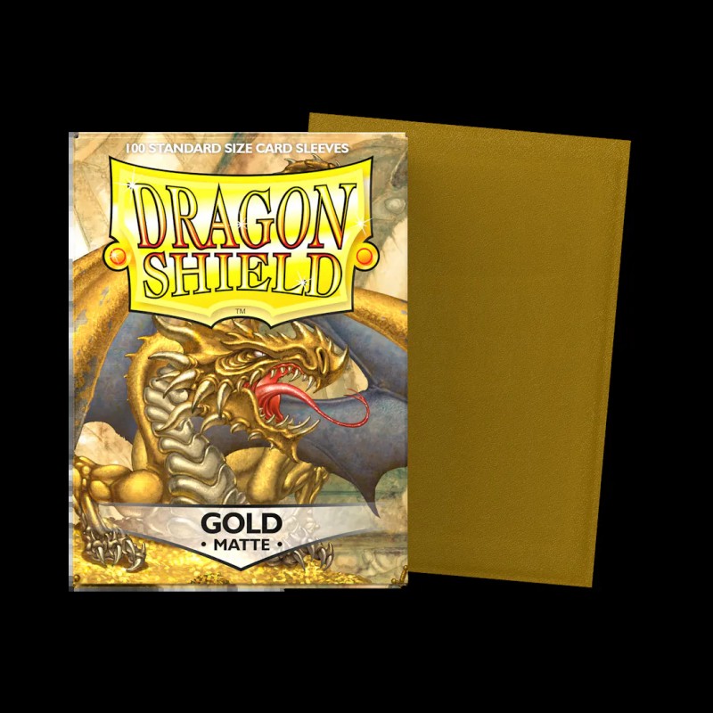 Gold, a regal metallic look gold. For decks in the upper echelon. Standard size card sleeves for cards sized measuring up to 63x88 mm's. Great for TCGs like MTG, Pokémon, Lorcana & Flesh and Blood! Matte Sleeves, a tactile delight. Durable sleeves with a textured backing for a great hand feel and buttery smooth shuffle feel. Experience the popular feel of Dragon Shield Mattes!