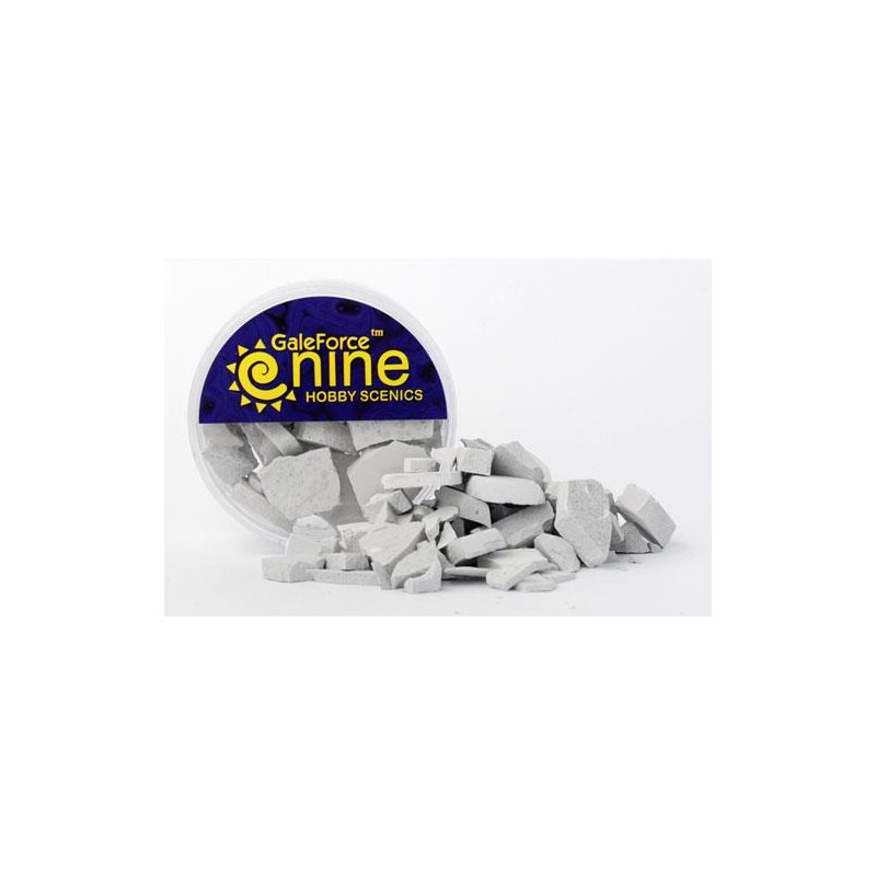 Concrete rubble creates incredibly realistic concrete because it’s just that: concrete. We use a super-fine powder, mix it, cast big sheets of the stuff, and then smash it up into manageable chunks. Our concrete rubble is tough enough to stand up to lots of games, but can be filed and detailed with normal hobby tools.