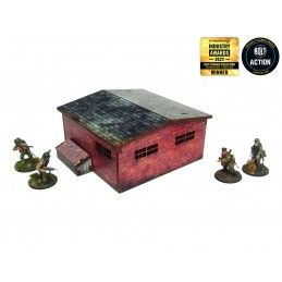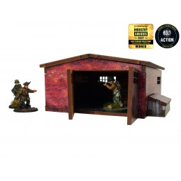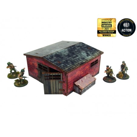 Multicolor prepainted (UV-printed) single level WW2 Normandy Large Brick Shed building with accessible colorful interior and removable roof. Option to assemble with open or closed doors. The gate can be opened or closed during play. Room to fit in a small vehicle or medium infantry squad inside. Scale: 28-30mm / 1:56. Bolt Action officially licensed product.
