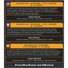 This special reprint brings together previously released Cassian Andor, K-2SO, and Jyn Erso figures in one set, now in a new format with improved, multilingual cards! It's the perfect opportunity to introduce this indispensable trio to your battlefield!