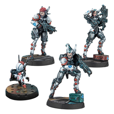 This box includes four metal miniatures: a Riot Grrl with Combi Rifle and E/Mitter, a Riot Grrl with Missile Launcher, a Riot Grrl with Boarding Shotgun, and one TinBot. This new Infinity unit box provides all the weapon options needed. Now you can compose a Fireteam of these Heavy Infantry from the Bakunin Sectorial Army. The Riot Grrls are the true daughters of punk and the street icons of urban warfare. This box is a great complement to the Bakunin Sectorial Army you started with the Bakunin Observance Action Pack.