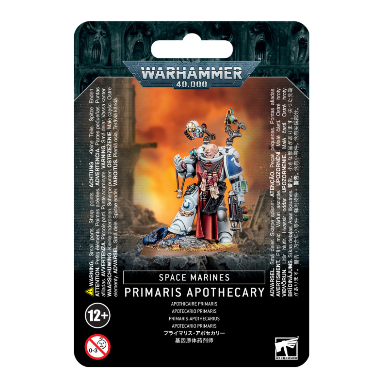 This multi-part plastic kit contains the components necessary to assemble a Primaris Apothecary. Strikingly detailed, clad as he is in Mk X power armour, this miniature features far more accoutrements and gadgets than the standard Primaris Space Marine - as befits his battlefield role. Strung around the chest plate are several canopic jars, bearing purity seals: these are filled with progenoid organs that have passed his scrutiny, and will be used in the creation of further Primaris Space Marines. In his right hand he clutches a freshly-hewn organ upon which his gaze is fixed; another canopic jar hangs from his arm, ready. His left arm holds a narthecium, the grisly instrument of his craft, though this can be replaced with an optional absolver pistol (often the last thing a fallen brother will see…)