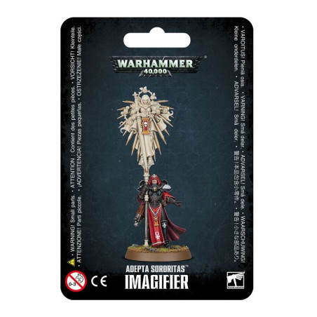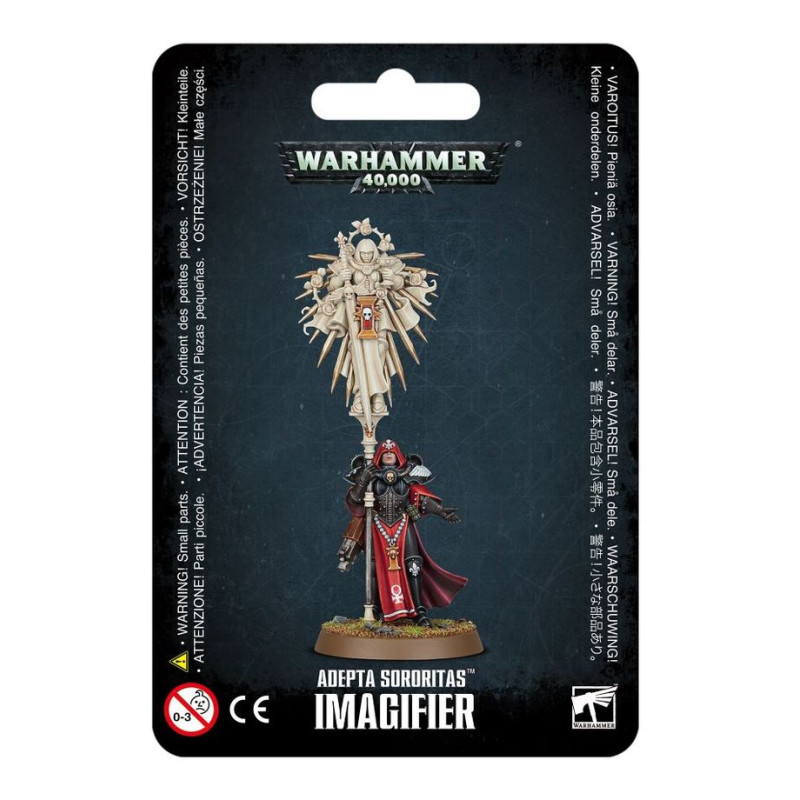 The kit builds a single Imagifier bearing a stanchion, atop which is mounted the image of a fallen saint wielding a chalice and sword. The Imagifier can be assembled with a choice of two head options - one is unhelmeted, with a low hanging hood over the Imagifier’s eyes, while the other is helmeted.