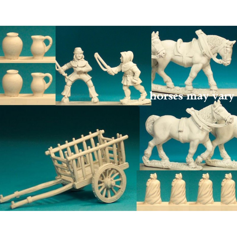 • 1 wagon, 1 rider, 1 man on foot, 2 horses, 4 sacks of arrows, and 4 jugs/pots (28mm approx size, metal) figures suitable for use with SAGA: Age of Chivalry.