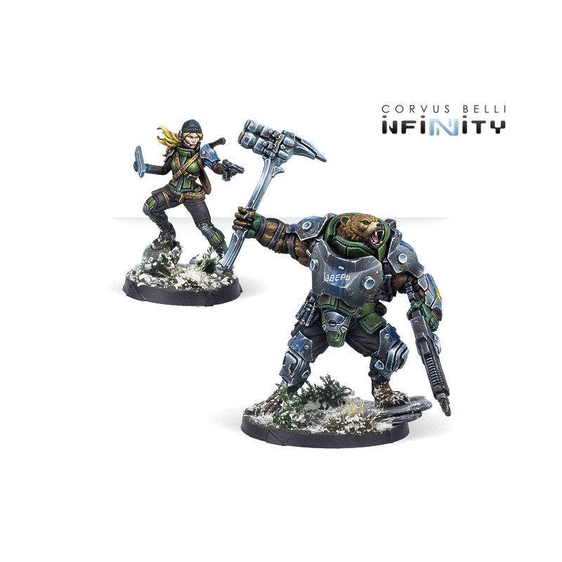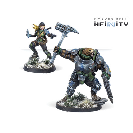 This box includes two miniatures: a thermoplastic-injected miniature of a Polaris Bearpode and a metal miniature of Masha, Polaris Controller. Add the savagery and brutality of the Polaris Team to your Ariadna army.