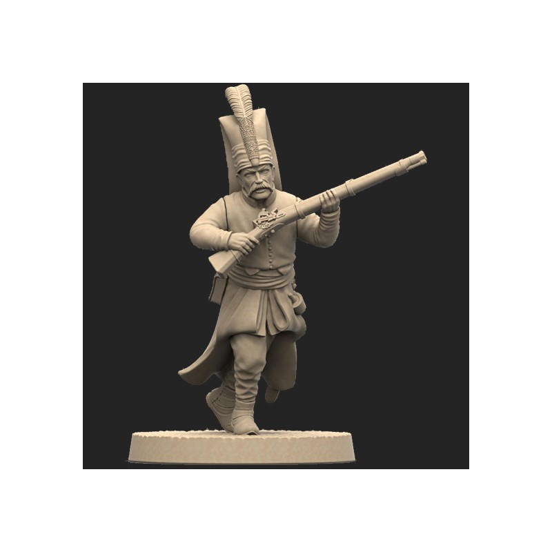 Jeden model oraz plastikowa podstawka. Model jest niepomalowany oraz niesklejony. Opakowanie NIE zawiera kart, model jest produktem kolekcjonerskim/dla malarzy, a nie elementem gry Anno Domini 1666.