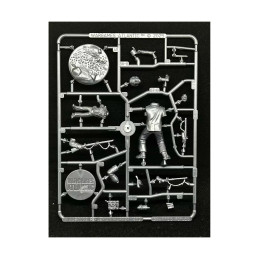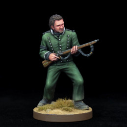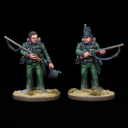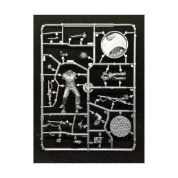 This hard plastic set includes one 54mm display piece with a scenic base and a 28mm version that can be built in two ways with a textured 25mm round base. The 54mm model depicts Harper as he defends Blas Vivar's chest by firing his ramrod into a French cavalryman. The 28mm model depicts Harper with or without his shako on march or ready to fire his rifle.